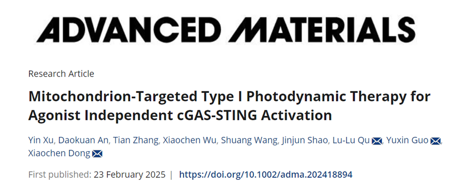 近日,我校董曉臣教授團(tuán)隊(duì)在“癌癥光免疫治療”領(lǐng)域取得了重要進(jìn)展,該成果以江蘇師范大學(xué)為第一通訊單位發(fā)表在國(guó)際知名期刊Advanced Materials上,題為“Mitochondrian-Targeted Type I PhotodynamicTherapy for Agonist Independent cGAS-STING Activation(線粒體靶向I型光動(dòng)力療法用于非激動(dòng)劑依賴的cGAS-STING通路激活)”。我校化學(xué)與材料科學(xué)學(xué)院碩士研究生徐銀為論文的第一作者,董曉臣教授、郭育新副教授以及渠陸陸教授為共同通訊作者。該論文受到了國(guó)家自然科學(xué)基金等項(xiàng)目的資助。