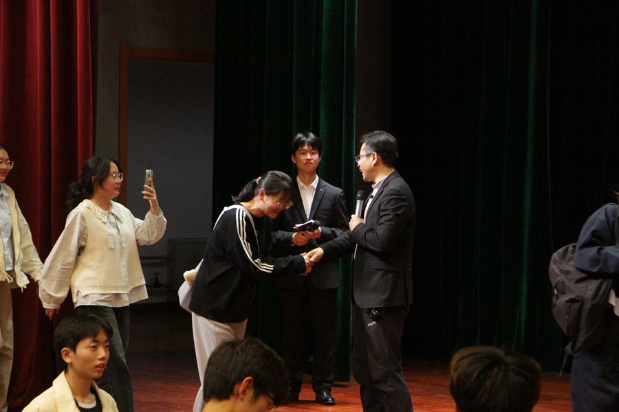 在趣味問答環節,宋浩結合“數學學科人文溫度”“心境變化”等提問,強調專業素養與人文關懷并重,并分享個人成長感悟,鼓勵學生保持積極心態,尊重緣分與自我成長。他寄語學子珍惜校園時光,高質量完成學業,全力沖刺更高學術舞臺;同時通過努力工作,為所愛之人創造更有品質的生活。現場互動熱烈,提問的學生紛紛與他合影,活動尾聲宋浩與在場同學一一握手致意。