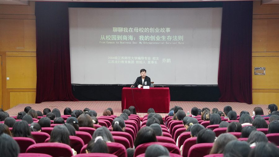 4月26日上午,2025年第六期“校友零距離”在泉山校區(qū)敬文報告廳舉行。我校2004級廣播電視編導(dǎo)專業(yè)校友、江蘇龍行教育集團(tuán)董事長喬鵬受邀重返母校,以“從校園到商海:我的創(chuàng)業(yè)生存法則”為主題,與同學(xué)們進(jìn)行交流互動。