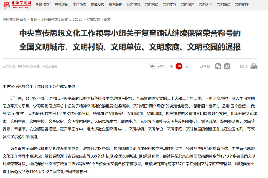 5月23日,全國精神文明建設表彰大會在京召開,習近平總書記對精神文明建設工作作出重要指示。會上公布了第七屆全國文明城市、文明村鎮、文明單位,第三屆全國文明家庭、文明校園,經嚴格規范的復查評估,我校確認繼續保留“全國文明校園”榮譽稱號。