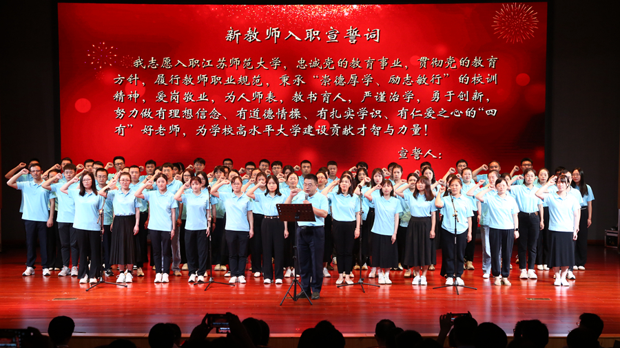 白手起梁溪風雨兼程弦歌不輟,丹青開錦卷德才并重理念常新。一代代江蘇師大人攜手并進,接續傳承著精神的火炬。每一年總有一批新鮮的血液注入江蘇師大的教師隊伍。大會上,新入職教師進行了入職宣誓。表彰大會在青年教師們的鏗鏘誓詞中落下帷幕。