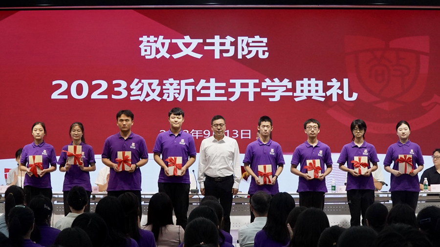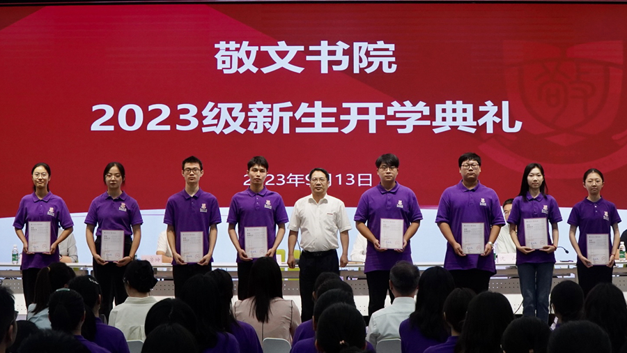 典禮上,周汝光為新生代表頒發(fā)敬文書院錄取榮譽證書,趙鵬向新生代表贈送《知行敬文》一書,學(xué)院領(lǐng)導(dǎo)向新生代表授予院徽。全體新生手撫院徽、面對院旗進行入院宣誓,堅定而洪亮地表達了“志在許國,吾為棟梁”的豪情壯志。開學(xué)典禮在激昂的《奔跑吧,敬文的少年》歌聲中落下帷幕。