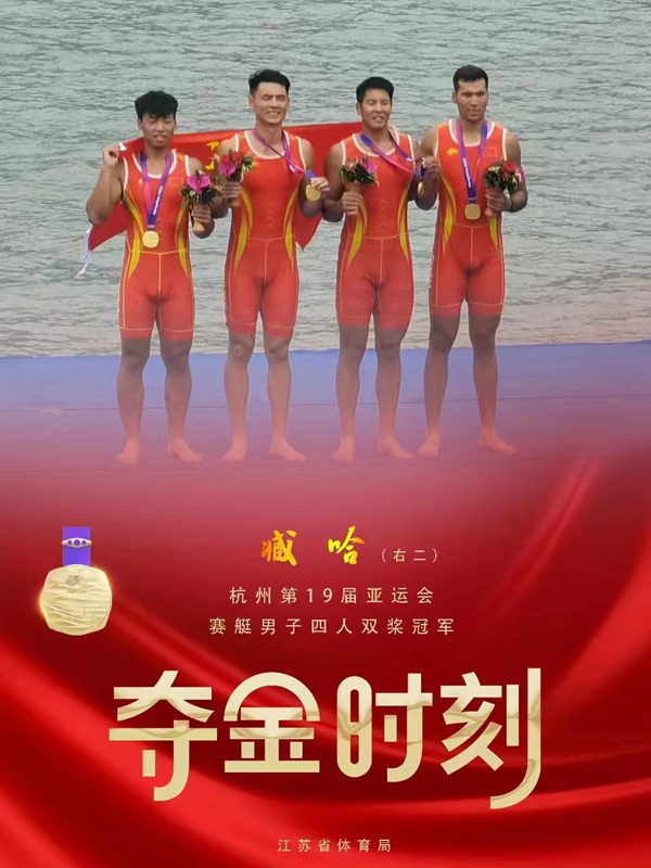 在賽艇項目中,我校有兩名畢業生參加比賽,分別是2023屆畢業生蔡鵬鵬和臧哈。在賽艇男子八人單槳有舵手決賽中,蔡鵬鵬與隊友團結協作,以5分40秒的成績奪得金牌,這是江蘇健兒參加杭州亞運會獲得的首枚金牌。同時,蔡鵬鵬在賽艇男子四人單槳決賽中奪得銀牌。在賽艇項目男子四人雙槳決賽中,臧哈搭檔隊友以6分02秒問鼎金牌。