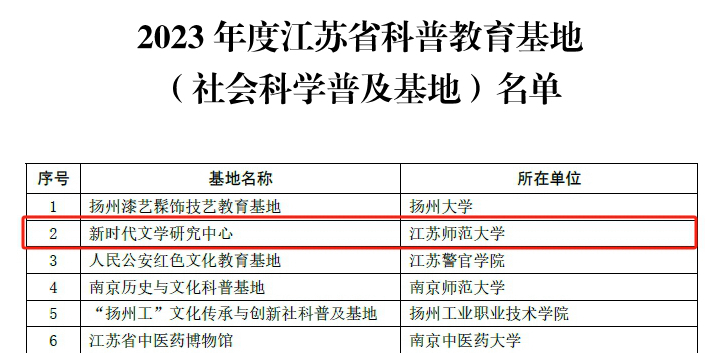 近日,江蘇省科學技術協會、江蘇省哲學社會科學界聯合會、江蘇省科學技術廳、江蘇省教育廳聯合下發《關于認定2023年度江蘇省科普教育基地的通知》,我校“新時代文學研究中心”成功獲批江蘇省社會科學普及基地,成為我校首家省級社會科學普及基地。