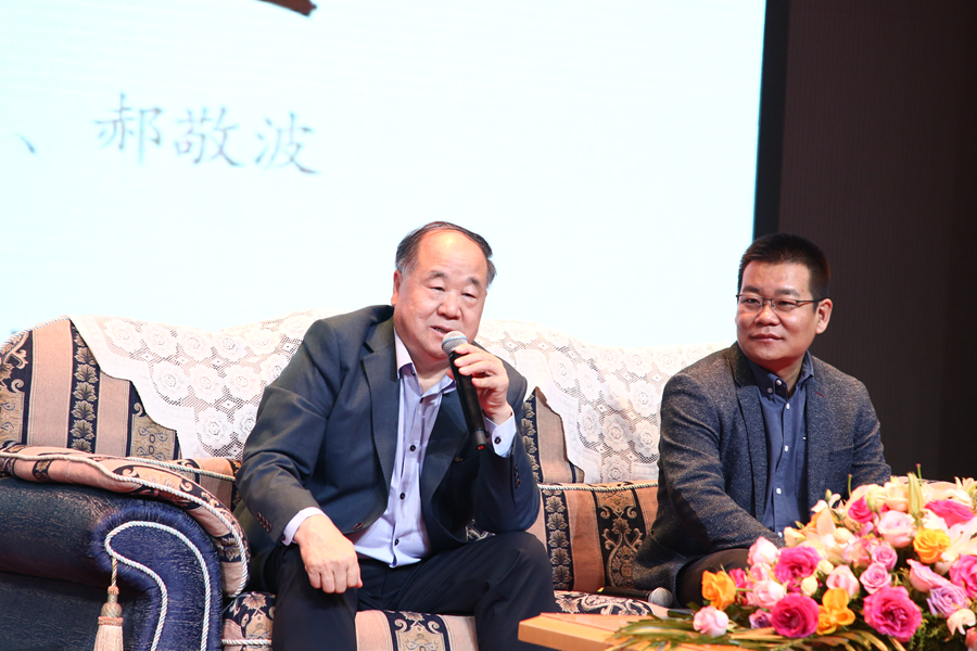 在報(bào)告會(huì)第二階段,作家莫言、徐則臣與學(xué)者蘇州大學(xué)文學(xué)院王堯教授、我校文學(xué)院郝敬波教授圍繞莫言的藝術(shù)創(chuàng)作話題展開圓桌對(duì)談。對(duì)談?dòng)赏鯃蚪淌谥鞒帧?duì)談會(huì)上,莫言闡述了由小說家向劇作家轉(zhuǎn)型的思想動(dòng)力和創(chuàng)作情結(jié),回顧了從湯顯祖到莎士比亞的中外戲劇傳統(tǒng),并就《鱷魚》創(chuàng)作的相關(guān)背景作了介紹。徐則臣就后諾獎(jiǎng)時(shí)代莫言的創(chuàng)作風(fēng)格的深刻變化作了細(xì)致剖析,并以自身文學(xué)創(chuàng)作的實(shí)踐體驗(yàn)闡釋了文學(xué)傳統(tǒng)書寫的獨(dú)特藝術(shù)魅力。王堯教授系統(tǒng)梳理了學(xué)術(shù)界對(duì)莫言作品的研究歷程,對(duì)莫言作品的敘事特點(diǎn)、鄉(xiāng)土意識(shí)、傳統(tǒng)文化情懷作了深入點(diǎn)評(píng)。郝敬波教授重點(diǎn)談了莫言作品的藝術(shù)影響力和帶動(dòng)效應(yīng),提出莫言藝術(shù)經(jīng)驗(yàn)中的傳統(tǒng)敘事、民間資源的傳承與探索對(duì)徐則臣等一代作家產(chǎn)生了深刻的影響。報(bào)告會(huì)現(xiàn)場(chǎng),莫言老師還就師生提出的相關(guān)學(xué)術(shù)問題進(jìn)行了互動(dòng)交流。