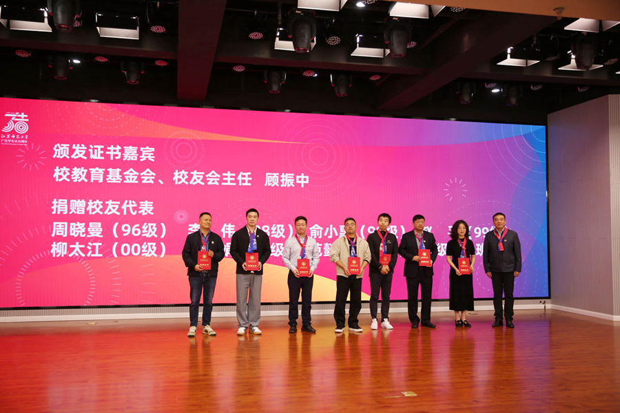 校教育基金會、校友會負責人向為此次慶典活動捐款捐物的校友趙平、俞小惠、李偉、柳太江、范懿銘、周曉曼、張樹娟、王弢頒發了捐贈證書。
