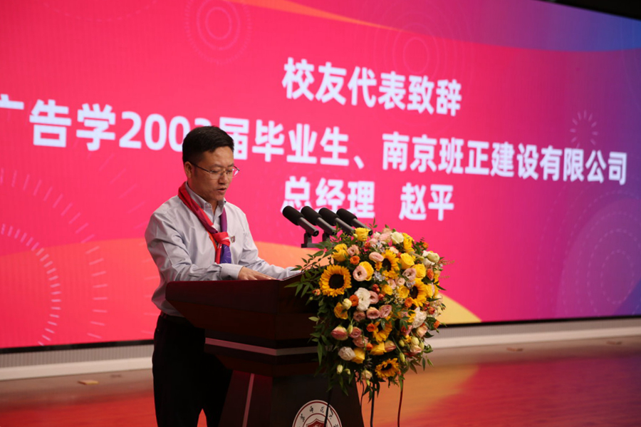 南京班正建設有限公司總經理、99級廣告班班長趙平代表廣告學專業校友致辭。他對廣告學專業30周年慶典致以誠摯的祝賀,分享自己在師大求學成長的故事,追憶師生情誼。他指出,廣告人擁有敏銳的洞察力,無限的創造力以及適應潮流、引領潮流的信心和能力,希望廣告學專業進一步強化產學研融合,提高人才培養質量。