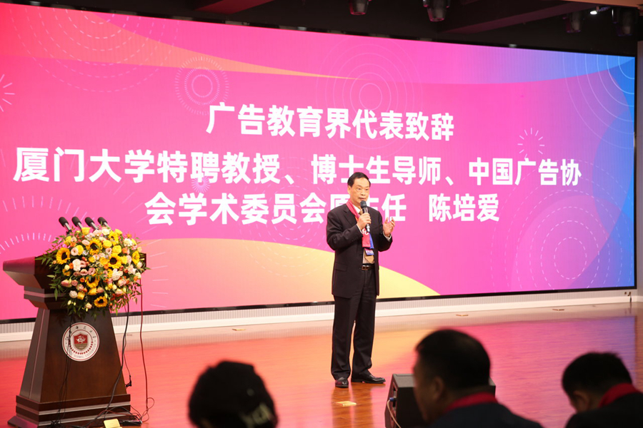 陳培愛代表廣告教育界致辭。他充分肯定了江蘇師范大學廣告學專業取得的豐碩成果,并結合個人學術研究和專業教學經歷,闡述中國廣告學專業和廣告事業40年的發展歷程和未來發展態勢,并熱情勉勵廣大師生為廣告專業、產業發展和中國品牌走向世界貢獻廣告人的智慧和力量。