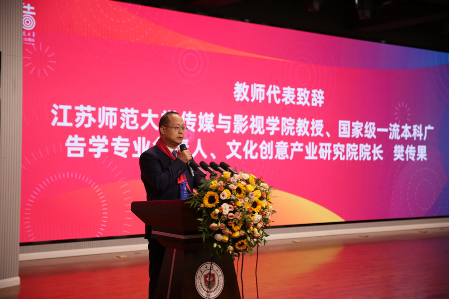 國家級一流廣告學專業負責人、江蘇師范大學文化創意產業研究院院長、傳媒與影視學院樊傳果教授代表廣告學專業教師致辭。他回顧了廣告學30年來的發展變遷,并感恩社會各界與各級領導、師生的關心、支持,期待各界朋友繼續關注廣告學專業的建設與發展,期待廣大校友常回家看看,期待廣告學專業學子賡續優良傳統,不忘初心、砥礪前行。