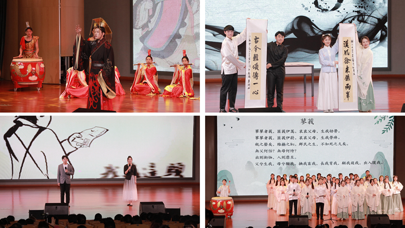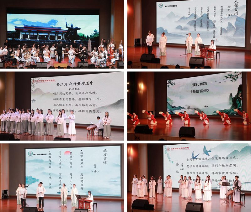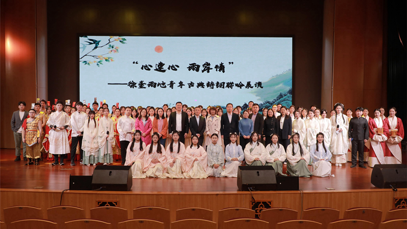 4日晚,“心連心 兩岸情”——徐臺兩地青年古典詩詞聯吟展演在馬可音樂廳舉行。演出節目分為“山河有情,日月共輝”“我有嘉賓,情牽漢唐”“君有歸期,同飲一觴”三個板塊。隨著民族樂團《一城山色半城湖》宛轉悠揚樂聲的響起,演出正式拉開序幕。來自輔仁大學東籬詩社學生的詩詞吟誦《八聲甘州·對瀟瀟暮雨灑江天》,讓在場的師生感受到了詩詞的婉轉綿長;文學院悠然詩社的詩詞吟誦《關山月》,鏗鏘有力,氣勢雄渾;奔放豪邁的吟誦《大風歌》將演出推向了高潮。文學院悠然詩社的學生現場潑墨揮毫,向輔仁大學東籬詩社贈送內容為“漢風徐來系兩岸,古今雅頌傳一心”的書法作品,祝福兩地青年攜手共進,建立更加深厚的友誼,將中華優秀傳統文化發揚光大。整場演出在兩校詩社聯袂吟誦的《蓼莪》中落下帷幕。