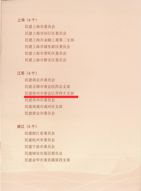 民建江蘇師大支部成立于2007年,共有會員26名,其中省人大代表1人、市政協常委1人、市政協委員1人、區政協委員2人。近年來,民建江蘇師大支部圍繞中心,服務大局,充分發揮特色優勢,多篇調研課題及社情民意受到了民建中央、民建省委、中共江蘇省委、省政協、市政協等表彰,在參政議政、服務地方、科技創新和文化建設等方面集智聚力、開拓創新。疫情期間,民建江蘇師大支部關心關愛民族學生,開展“關愛疫情中的在校民族學生,助力學校民族學生管理”工作,搭建民建會員和民族學生溝通的橋梁,構建“一對一”結對幫扶模式,逐步打造徐州民建“攜手育星”社會服務品牌。