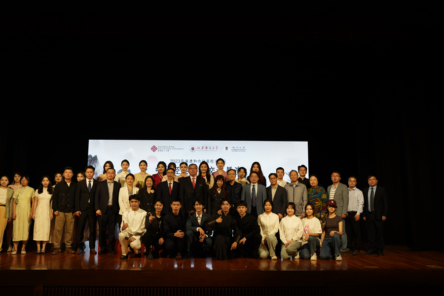 11月13日下午和16日下午,港澳展演活動(dòng)分別在香港理工大學(xué)蔣震劇院和澳門大學(xué)黑盒劇院舉行開(kāi)幕典禮。香港理工大學(xué)副校長(zhǎng)趙汝恒教授、人文學(xué)院院長(zhǎng)李平教授、中文及雙語(yǔ)系系主任蕭慧婷教授,我校原副校長(zhǎng)錢進(jìn)教授、語(yǔ)言科學(xué)與藝術(shù)學(xué)院副院長(zhǎng)朱祖德教授,澳門大學(xué)人文學(xué)院院長(zhǎng)徐杰教授、助理院長(zhǎng)張?jiān)陆淌凇⒗铥惽嘟淌诘茸鳛槿鼗顒?dòng)主辦方的代表出席兩地展演開(kāi)幕式并致辭。