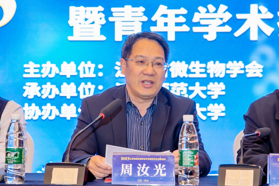 周汝光在開幕式致辭中向來自全國各地的專家學者和參會人員表示歡迎,向學會給予學校的信任和支持表示感謝,并向與會專家介紹了學校的基本情況。他指出,江蘇師大依托“江蘇省生物學優勢學科”“江蘇省生態學重點培育學科”等學科優勢,積極推動團隊創新發展,先后獲批“江蘇省藥用植物生物技術重點實驗室”“江蘇省藥食資源生物技術國家重點實驗室(培育點)”“江蘇省系統發育與比較基因組學重點實驗室”,獲得江蘇省高校“微生物前期開發”和“系統發育與比較基因組學”優秀科技創新團隊等多項榮譽。近年來,微生物學領域實現了多項研究成果的新突破,在團隊建設、人才培養、科學研究和國際合作等也取得了顯著成效。同時希望通過此次學術年會,進一步加強微生物專家學者之間的合作與交流,推動微生物學科的進步與發展。