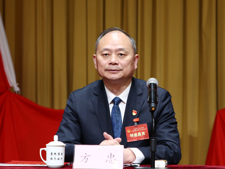 大會(huì)在嘹亮的國(guó)歌、團(tuán)歌聲中拉開序幕。校黨委書記方忠代表校黨委對(duì)大會(huì)的召開表示熱烈祝賀,對(duì)為共青團(tuán)事業(yè)付出辛勤努力的廣大青年師生表示衷心感謝。方忠充分肯定了我校共青團(tuán)工作四年來取得的各項(xiàng)成績(jī)。他指出,校第三次黨代會(huì)確立了“建設(shè)特色鮮明、國(guó)內(nèi)一流、國(guó)際知名的高水平師范大學(xué)”的奮斗目標(biāo),我校各級(jí)團(tuán)組織和廣大青年要發(fā)揚(yáng)“黨有號(hào)召,團(tuán)有行動(dòng)”的光榮傳統(tǒng),踔厲奮發(fā)、勇毅前行,為學(xué)校事業(yè)高質(zhì)量發(fā)展貢獻(xiàn)青春力量。方忠向全校各級(jí)團(tuán)組織、團(tuán)干部和廣大團(tuán)員青年提出三點(diǎn)要求和希望,一是希望各級(jí)團(tuán)組織服務(wù)大局,心系青年,積蓄青春建功強(qiáng)勁動(dòng)能;二是希望全體團(tuán)干部履職盡責(zé),擔(dān)當(dāng)實(shí)干,凝聚青春成長(zhǎng)向上力量;三是希望廣大團(tuán)員青年堅(jiān)定信仰,奮發(fā)有為,彰顯青春昂揚(yáng)精神風(fēng)貌。