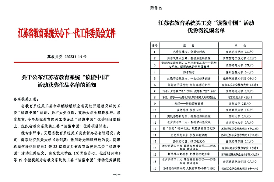 近日,江蘇省教育系統(tǒng)關(guān)工委發(fā)布《關(guān)于公布江蘇省教育系統(tǒng)“讀懂中國”活動(dòng)獲獎(jiǎng)作品名單的通知》(蘇教關(guān)委〔2023〕14號),我校關(guān)工委報(bào)送的我校原校長周明儒教授事跡《貢獻(xiàn)未必須在職,人生應(yīng)有第二春——記初心不改、退而未休的周明儒教授》紀(jì)錄片榮獲“優(yōu)秀微視頻”獎(jiǎng)。
