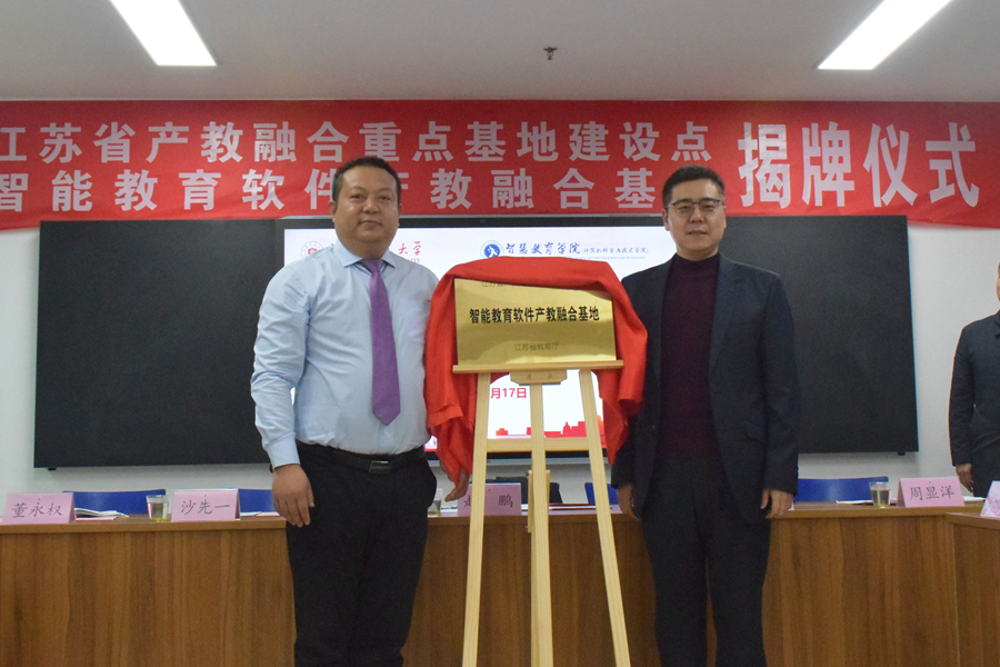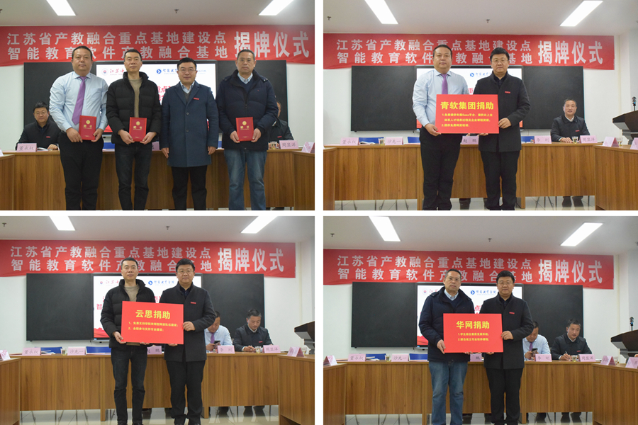 趙鵬和李剛共同為江蘇省產(chǎn)教融合重點(diǎn)基地建設(shè)點(diǎn)(智能教育軟件產(chǎn)教融合基地)揭牌。合作企業(yè)向基地和學(xué)院捐助了平臺(tái)資源及免費(fèi)師資培訓(xùn)項(xiàng)目。儀式上,還為相關(guān)企業(yè)家代表頒發(fā)了產(chǎn)教融合基地建設(shè)顧問(wèn)聘書。