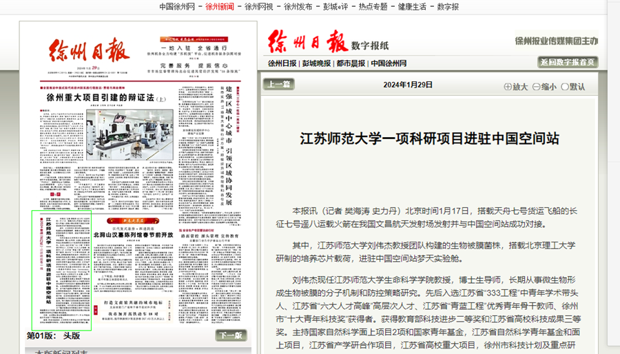 徐州日報1月29日報道我校科研成果入駐中國空間站,報道內(nèi)容如下: