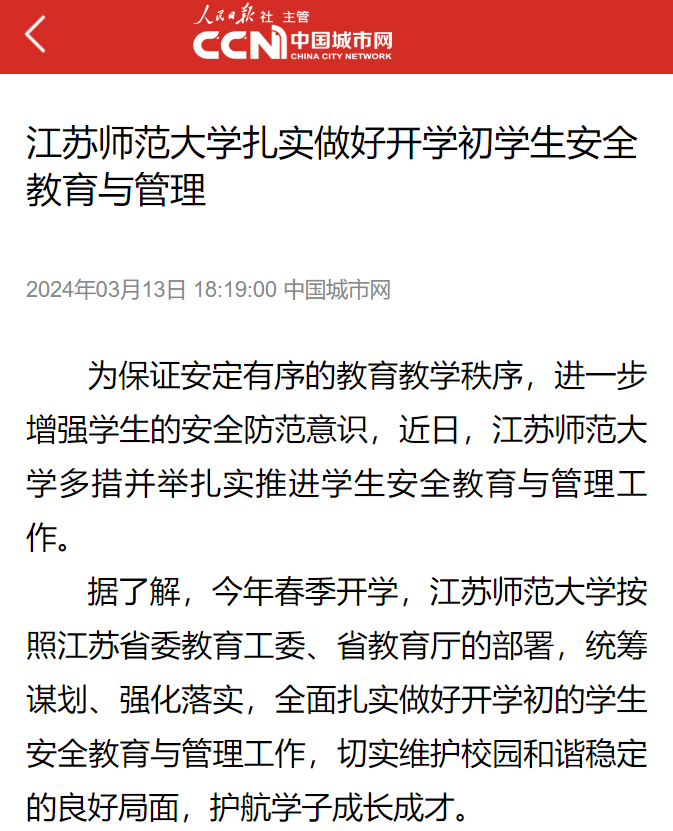 據了解,今年春季開學,江蘇師范大學按照江蘇省委教育工委、省教育廳的部署,統籌謀劃、強化落實,全面扎實做好開學初的學生安全教育與管理工作,切實維護校園和諧穩定的良好局面,護航學子成長成才。