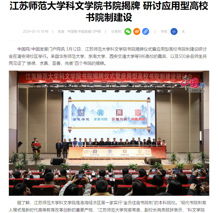 中國網/中國發展門戶網訊 3月12日,江蘇師范大學科文學院書院揭牌儀式暨應用型高校書院制建設研討會在潘安湖校區舉行。來自華東師范大學、東南大學、西安交通大學等9所高校的嘉賓,以及500余名師生共同見證了“崇德、求真、至善、尚美”四個書院的揭牌。