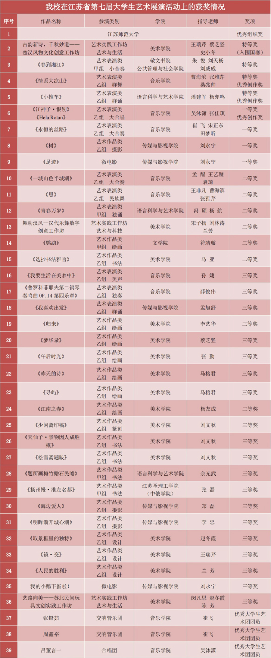 長期以來,學校高度重視美育工作,堅持美育在人才培養(yǎng)中的重要地位。本屆展演活動自啟動以來,我校黨政領導高度重視,校團委(藝術教育中心)認真籌備,著力加強與相關部門、學院的協(xié)同配合,結合師范特色,舉辦我校師范生技能展演,創(chuàng)新開展首屆青年才藝大賽暨江蘇省第七屆大學生藝術展演活動校內(nèi)選拔賽,通過作品展示、評委評審、專家推薦等環(huán)節(jié),推報優(yōu)秀作品參加省賽。各參賽學院精心組織,全情投入,為作品創(chuàng)作、遴選、指導、參賽等提供寶貴支持。各參賽師生以高度的責任感和飽滿的熱情深入挖掘創(chuàng)作題材、不斷打磨精品、開展集中訓練,展現(xiàn)了較好的藝術修養(yǎng)和昂揚向上的精神風貌,生動詮釋了蘇師學子積極進取的價值追求。江蘇省大學生藝術展演活動是我省目前規(guī)格最高、規(guī)模最大、影響最廣的大學生藝術盛會,由省教育廳舉辦,每三年一屆,本屆展演活動以“厚植家國情懷,涵養(yǎng)進取品格”為主題,共分為藝術表演類(聲樂、器樂、舞蹈、戲劇、朗誦)、藝術作品類(繪畫、書法和篆刻、攝影、設計、微電影)、藝術實踐工作坊、高校美育改革創(chuàng)新優(yōu)秀案例等四大類別,按照非專業(yè)組(甲組)與專業(yè)組(乙組)進行比賽,集中展現(xiàn)當代大學生與時代同向、與祖國同行、胸懷家國、奮力筑夢的價值追求。
