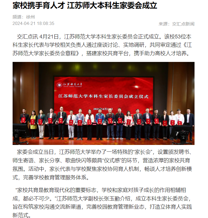 交匯點訊 4月21日,江蘇師范大學本科生家長委員會正式成立。該校53位本科生家長代表與學校相關負責人通過座談討論、實地調研,共同審定通過《江蘇師范大學家長委員會章程》,搭建家校共育平臺,攜手助力高校人才培養。