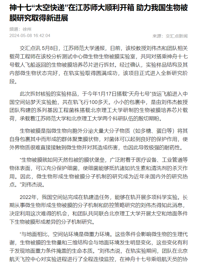 神十七“太空快遞”在江蘇師大順利開箱 助力我國生物被膜研究取得新進(jìn)展