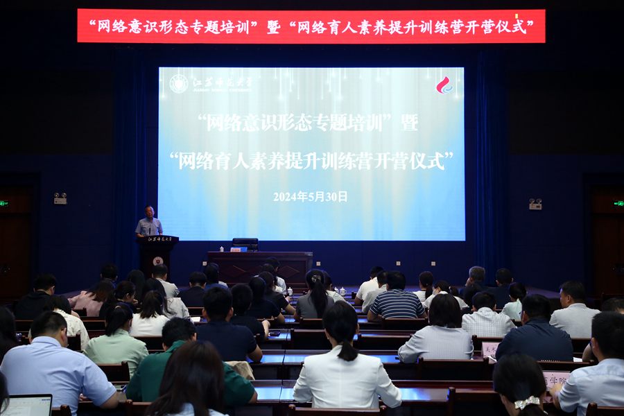 為深入學(xué)習(xí)貫徹習(xí)近平新時代中國特色社會主義思想和黨的二十大精神,深入實(shí)施“時代新人鑄魂工程”,提升學(xué)校思想政治工作隊(duì)伍網(wǎng)絡(luò)育人素養(yǎng),進(jìn)一步增強(qiáng)意識形態(tài)工作能力,我校舉辦網(wǎng)絡(luò)意識形態(tài)專題培訓(xùn)暨網(wǎng)絡(luò)育人素養(yǎng)提升訓(xùn)練營。5月30日上午,訓(xùn)練營開營儀式暨專題培訓(xùn)首場報告會在分析測試中心100舉行。校黨委副書記蔡國春出席儀式并講話。江蘇省網(wǎng)絡(luò)文明研究中心執(zhí)行主任,南京師范大學(xué)新聞與傳播學(xué)院二級教授、博士生導(dǎo)師張曉鋒應(yīng)邀作首場專家報告。各學(xué)院黨委書記、副書記、黨務(wù)秘書、網(wǎng)絡(luò)思政工作人員代表參加活動。校黨委常委、宣傳部部長孟召學(xué)主持活動。