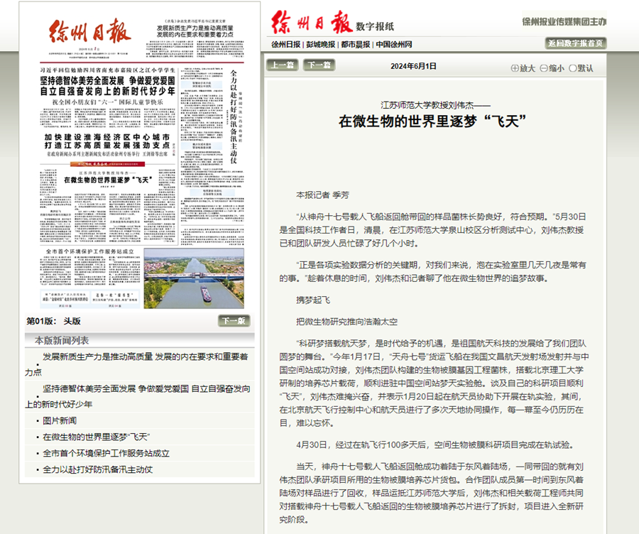 徐州日報6月1日報道我校劉偉杰教授團隊科研成果,報道內容如下: