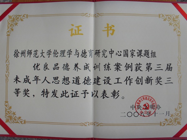 日前,校倫理學(xué)與德育研究中心接到中央文明辦、江蘇省文明辦頒發(fā)的證書(shū)和獎(jiǎng)金,該中心申報(bào)的科研成果“優(yōu)良品德養(yǎng)成訓(xùn)練”獲中央文明辦舉辦的“全國(guó)第三屆未成年人思想道德建設(shè)工作創(chuàng)新獎(jiǎng)”三等獎(jiǎng)(全國(guó)各類獎(jiǎng)項(xiàng)共60項(xiàng))。該成果同時(shí)獲得江蘇省文明辦舉辦的“江蘇省第二屆未成年人思想道德建設(shè)工作創(chuàng)新獎(jiǎng)”一等獎(jiǎng)。