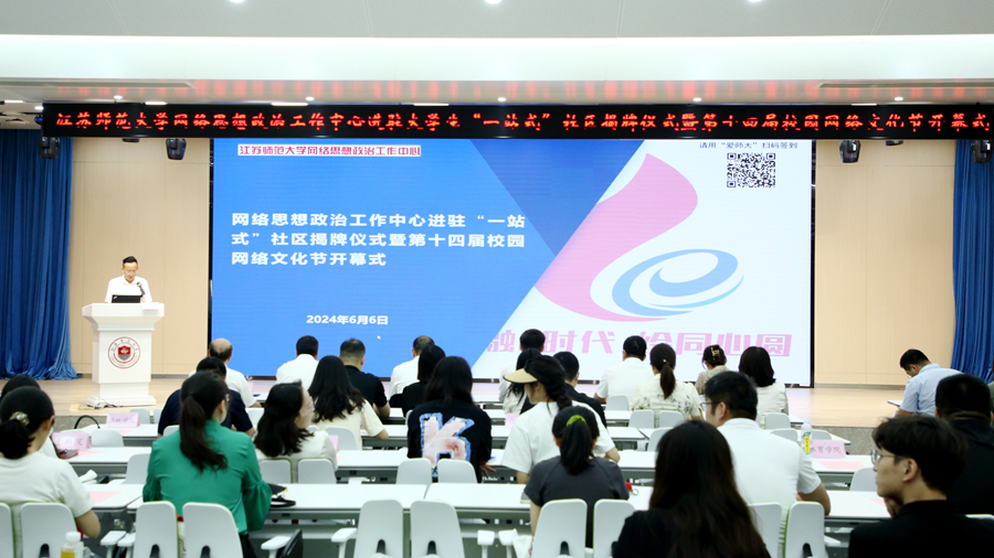 6月6日上午,江蘇師范大學網絡思想政治工作中心進駐“一站式”社區揭牌儀式暨第十四屆校園網絡文化節開幕式在路演大廳舉行。校黨委副書記蔡國春,江蘇省高校網絡思想政治工作中心副主任蔡炳鋒出席活動,相關職能部門主要負責人及各學院網絡思政中心工作站部分成員參加活動。活動由校黨委常委、宣傳部部長孟召學主持。