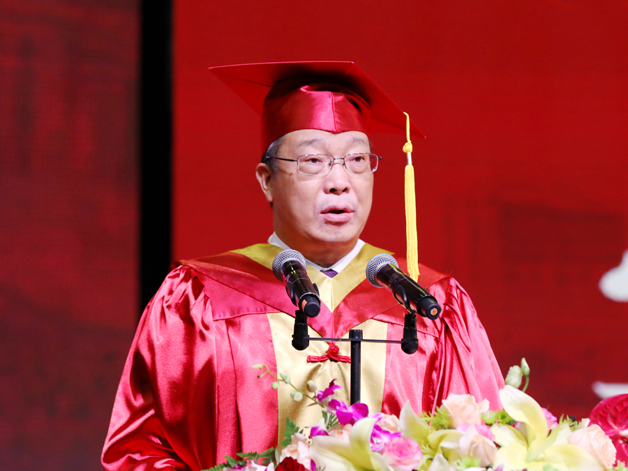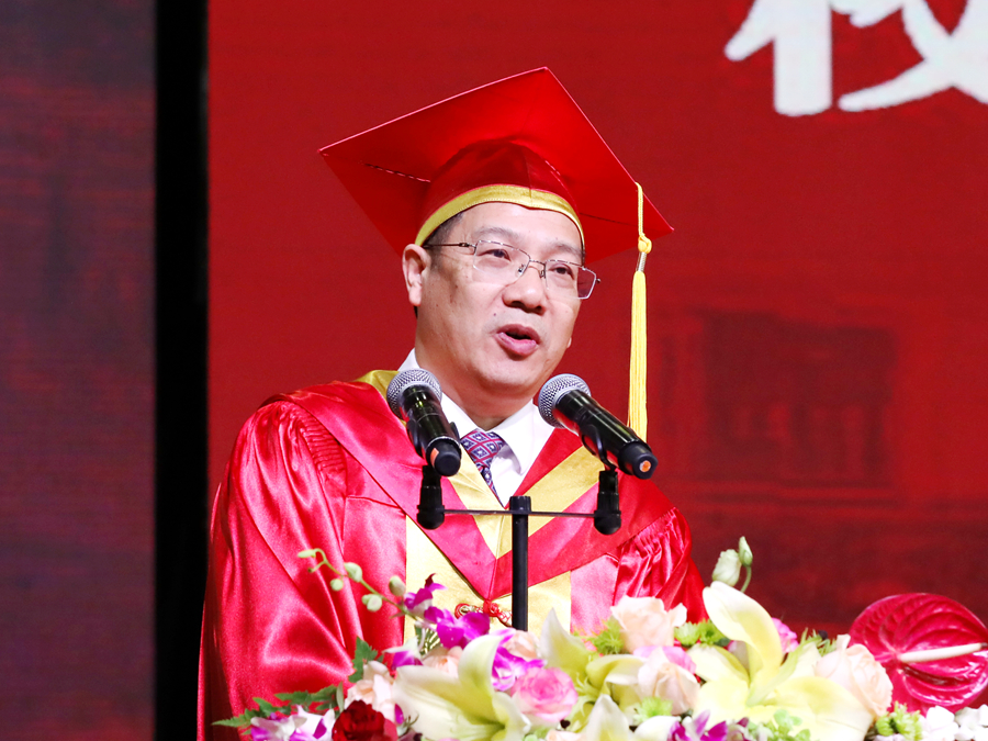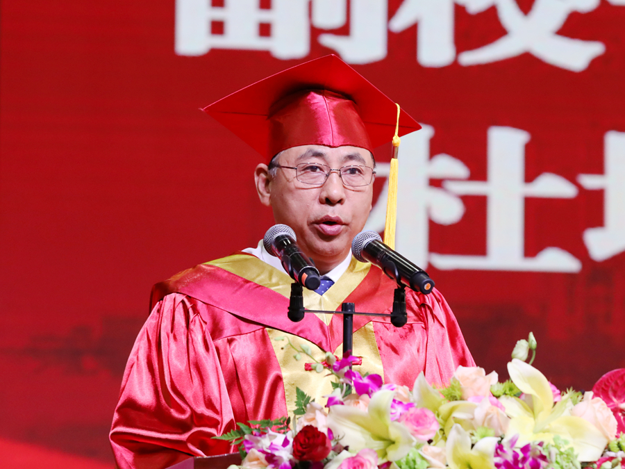 伴隨著莊嚴的國歌聲,畢業典禮正式開幕。校長、校學位評定委員會主席周汝光在典禮上致辭,代表學校向即將開啟人生新篇章的畢業研究生們表示熱烈的祝賀,向悉心培育、默默支持畢業研究生們的導師、家人和所有付出辛勞的師生員工表示衷心感謝。周汝光以“以青春之名,赴時代之約”為題,飽含深情地回顧了全體畢業研究生攜手度過的師大歲月和在讀期間取得的成績。他寄語全體畢業研究生,要把個人的理想藍圖與中國式現代化的宏大偉業聯系起來,積極投身祖國波瀾壯闊的建設實踐之中,與社會發展同頻共振,不斷增強做中國人的志氣、骨氣、底氣。要堅定信念,做矢志不渝的愛國者;要接續奮斗,做不負時代的實干家;要心胸豁達,做從容不迫的樂天派。周汝光希望全體畢業研究生秉持“崇德厚學 勵志敏行”的校訓,惟實勵新、精進臻善,帶著母校的祝福奔赴下一場人生旅途,盡情憧憬、勇敢熱愛、不懈奮斗。