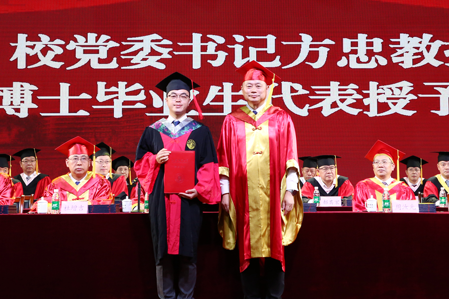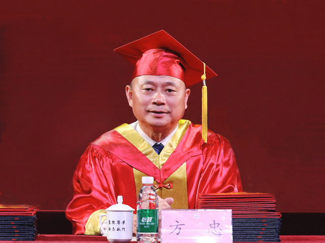 校黨委書記方忠為博士畢業生代表正冠撥穗