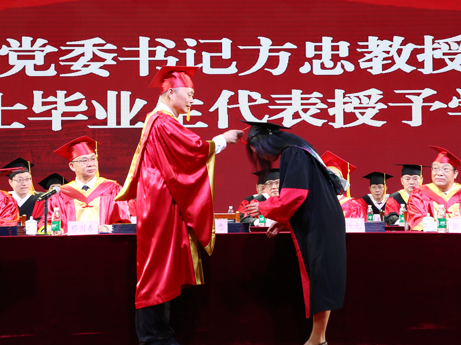 副校長、校學位評定委員會副主席杜增吉宣讀學位授予決定。校黨委書記方忠為博士畢業生代表正冠撥穗并授予學位。校領導、校學位評定委員會委員為全體2024屆碩士畢業研究生正冠撥穗,祝賀他們順利畢業。