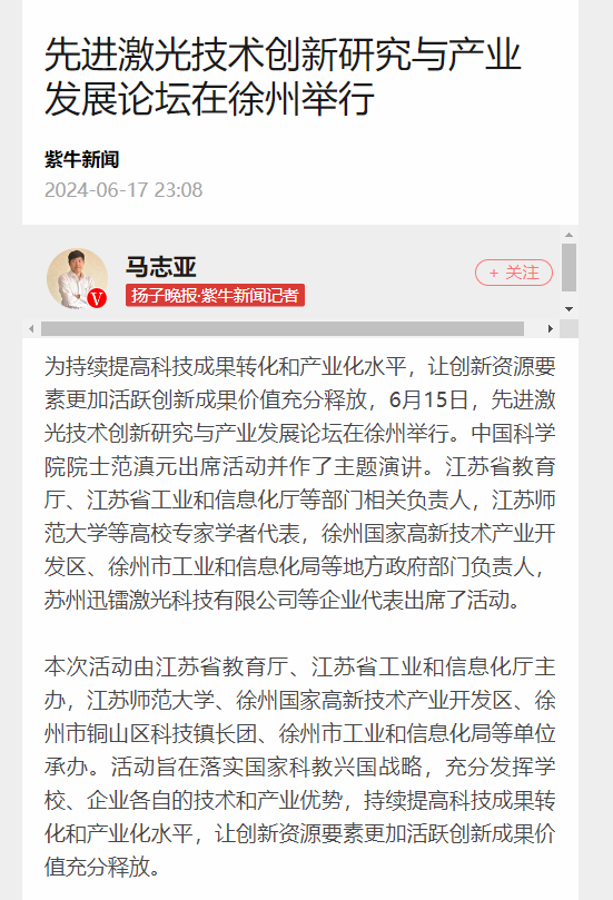 揚子晚報紫牛新聞6月17日報道在我校舉辦的先進激光技術創新研究與產業發展論壇,報道內容如下: