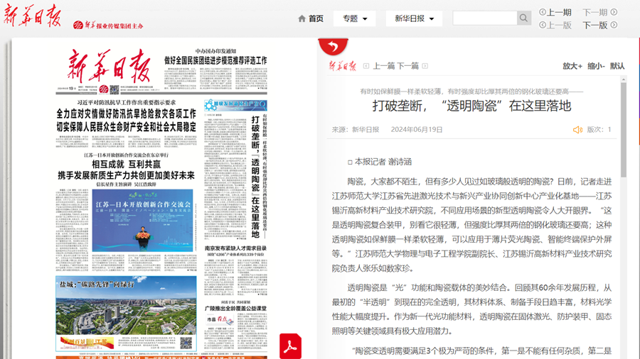 新華日?qǐng)?bào)6月19日于首頁報(bào)道我校“透明陶瓷”科研成果,報(bào)道內(nèi)容如下: