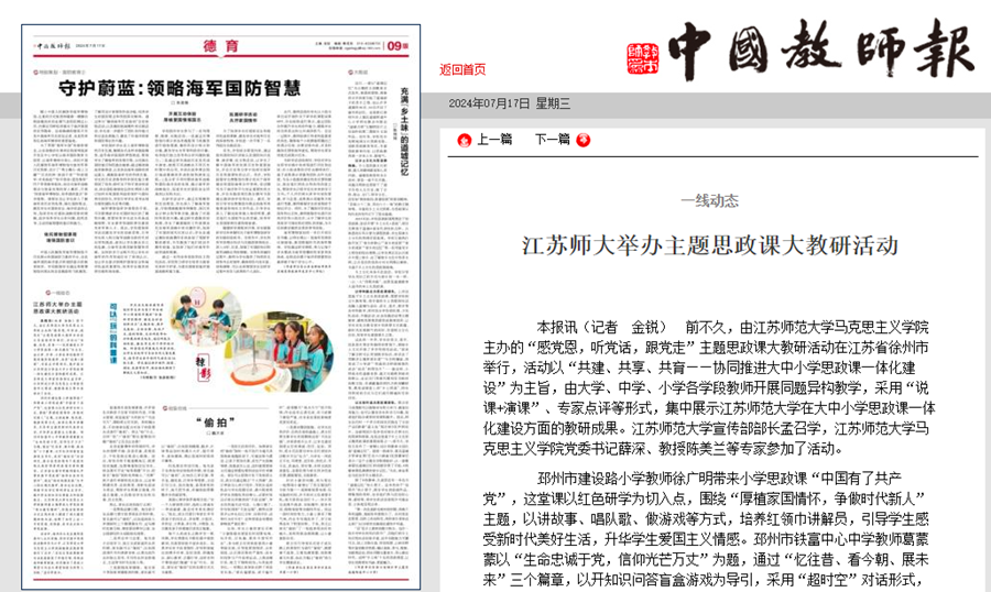 本報訊(記者 金銳) 前不久,由江蘇師范大學馬克思主義學院主辦的“感黨恩,聽黨話,跟黨走”主題思政課大教研活動在江蘇省徐州市舉行,活動以“共建、共享、共育——協(xié)同推進大中小學思政課一體化建設”為主旨,由大學、中學、小學各學段教師開展同題異構教學,采用“說課+演課”、專家點評等形式,集中展示江蘇師范大學在大中小學思政課一體化建設方面的教研成果。江蘇師范大學宣傳部部長孟召學,江蘇師范大學馬克思主義學院黨委書記薛深、教授陳美蘭等專家參加了活動。