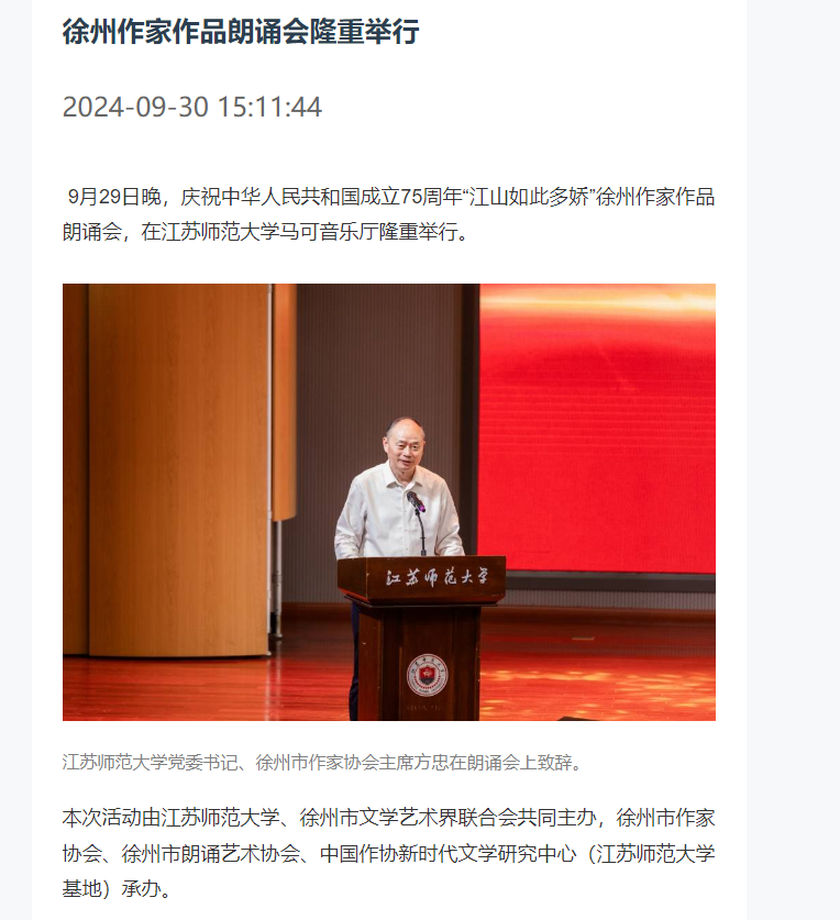 本次活動(dòng)由江蘇師范大學(xué)、徐州市文學(xué)藝術(shù)界聯(lián)合會(huì)共同主辦,徐州市作家協(xié)會(huì)、徐州市朗誦藝術(shù)協(xié)會(huì)、中國(guó)作協(xié)新時(shí)代文學(xué)研究中心(江蘇師范大學(xué)基地)承辦。