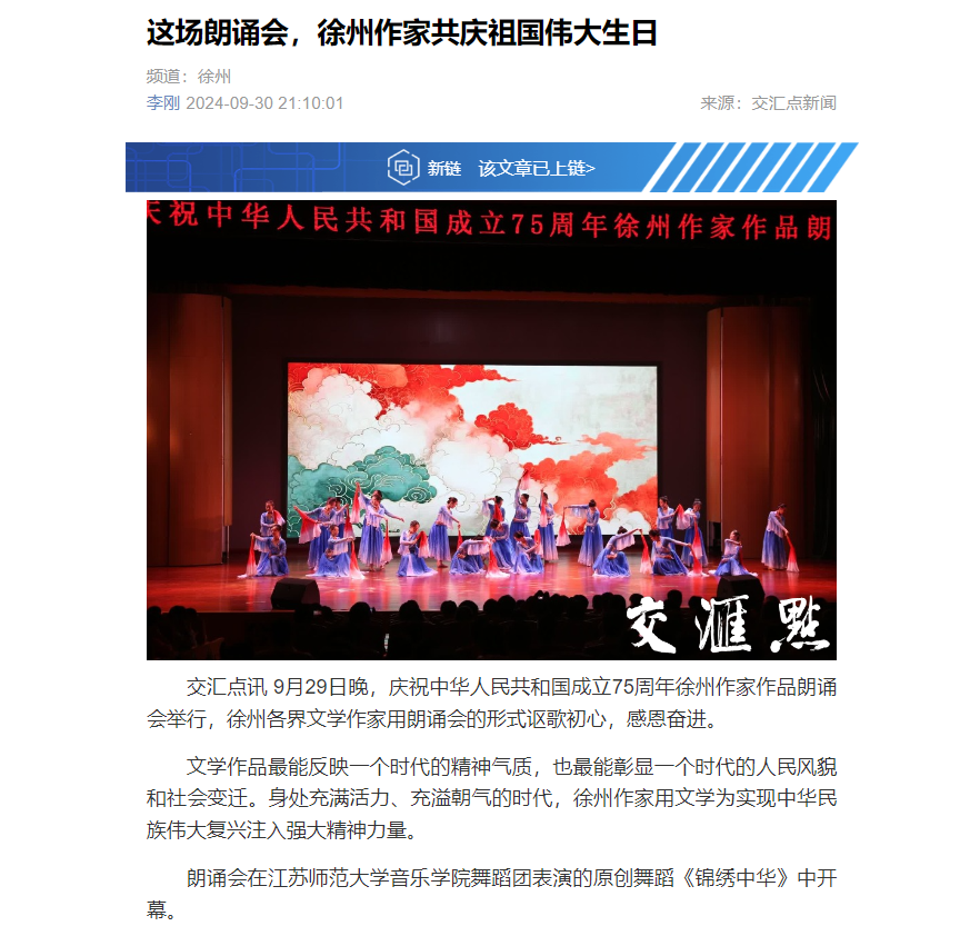 交匯點新聞9月30日報道我校舉辦的慶祝中華人民共和國成立75周年徐州作家作品朗誦會,報道內容如下: