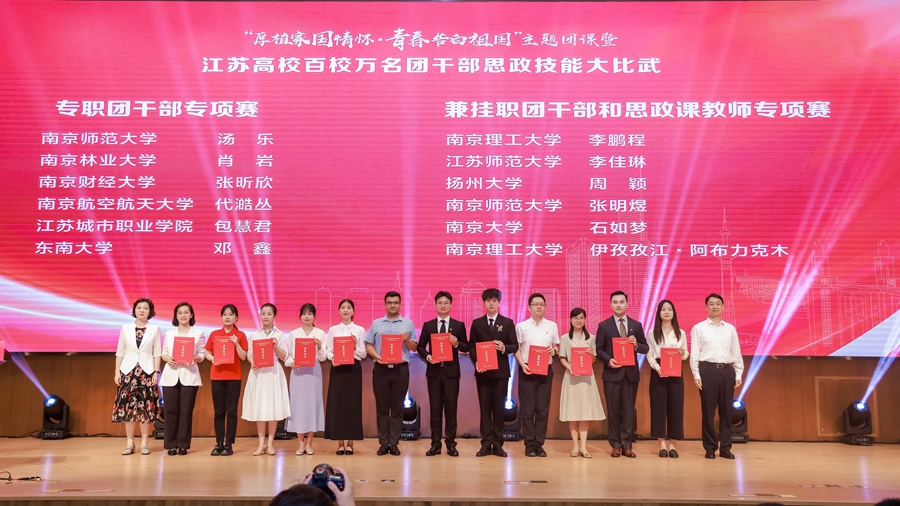 9月29日,由共青團(tuán)江蘇省委聯(lián)合中共江蘇省委教育工委、新華日?qǐng)?bào)社、江蘇省學(xué)生聯(lián)合會(huì)共同舉辦的第四屆江蘇高校百校萬(wàn)名團(tuán)干部思政技能大比武決賽在南京林業(yè)大學(xué)舉行。經(jīng)過決賽評(píng)審,我校榮獲特等獎(jiǎng)2項(xiàng),一等獎(jiǎng)2項(xiàng),二等獎(jiǎng)2項(xiàng),特等獎(jiǎng)總數(shù)并列全省第二。