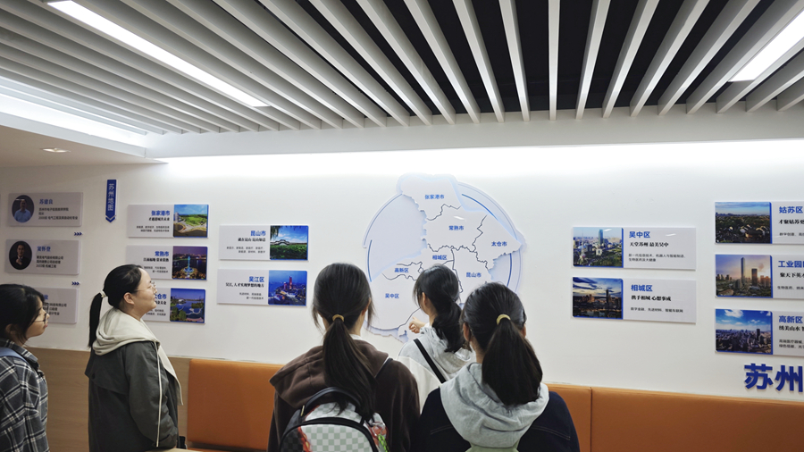 張玉勤與李健共同為“蘇州人才驛站”揭牌,并一同參觀了驛站,觀看了蘇州宣傳短片。參觀過程中,張玉勤回顧了學校與蘇州市在畢業生就業方面的合作情況,他指出學校“蘇州人才驛站”作為全省第三家實體建成并運營的站點,要發揮人才驛站的服務職能和示范帶動作用,做好人才驛站的運營管理、經驗總結和探索創新等,將人才驛站建設成為學校與地方人才部門合作的典范和服務大學生求職就業的樣本。