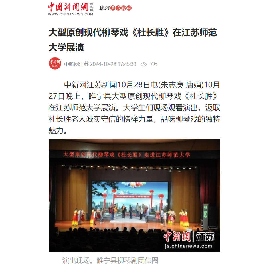 中國新聞網(wǎng)10月28日報道在我校演出的大型原創(chuàng)現(xiàn)代柳琴戲《杜長勝》,報道內容如下:
