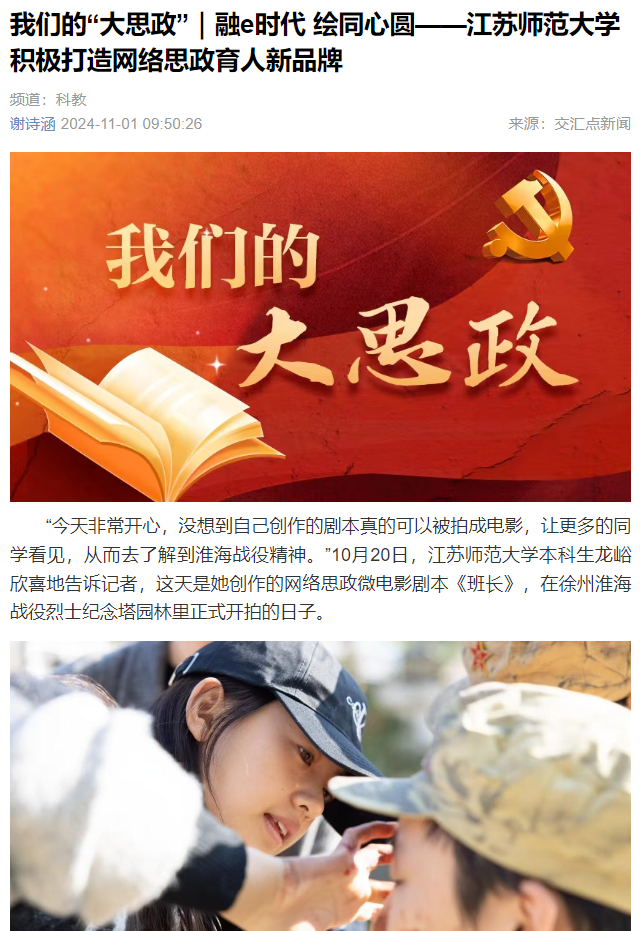 一直以來(lái),江蘇師范大學(xué)積極探索網(wǎng)絡(luò)思政育人新路徑,通過(guò)“協(xié)同育人、平臺(tái)建設(shè)、文化浸潤(rùn)”等舉措,打造網(wǎng)絡(luò)思政育人新品牌。與龍峪同學(xué)作品同期獲得支持得以轉(zhuǎn)化為電影的劇本還有3個(gè),分別圍繞中國(guó)共產(chǎn)黨的精神譜系、鄉(xiāng)村振興、非遺傳承等為主題,以“數(shù)智+藝術(shù)”賦能,用大學(xué)生喜聞樂(lè)見(jiàn)的微電影形式,推動(dòng)黨的創(chuàng)新理論真正落地生根,提升育人感染力。