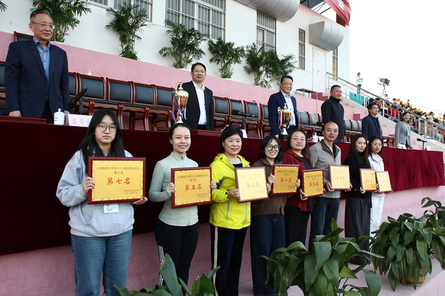 11月1日下午,在完成全部賽事后,江蘇師范大學(xué)第五十八屆田徑運(yùn)動(dòng)會(huì)勝利閉幕。有關(guān)校領(lǐng)導(dǎo)和校體育委員會(huì)全體委員出席閉幕式。閉幕式上宣布了比賽結(jié)果,并舉行了頒獎(jiǎng)儀式。敬文書(shū)院獲得學(xué)生組男女團(tuán)體總分第一名,物理與電子工程學(xué)院獲得教工組男女團(tuán)體總分第一名,分別蟬聯(lián)“流動(dòng)獎(jiǎng)杯”。外國(guó)語(yǔ)學(xué)院、教育科學(xué)學(xué)院(教師教育學(xué)院)、物理與電子工程學(xué)院、公共管理與社會(huì)學(xué)院、電氣工程及自動(dòng)化學(xué)院、數(shù)學(xué)與統(tǒng)計(jì)學(xué)院、化學(xué)與材料科學(xué)學(xué)院、商學(xué)院等8家單位獲得本屆田徑運(yùn)動(dòng)會(huì)精神文明獎(jiǎng)。體育學(xué)院、音樂(lè)學(xué)院、教育科學(xué)學(xué)院(教師教育學(xué)院)獲得本屆田徑運(yùn)動(dòng)會(huì)體育文化展示一等獎(jiǎng)。