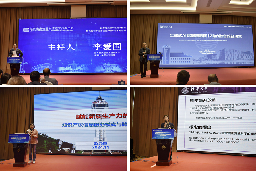 會議主旨報告環節,南京大學圖書館副館長邵波作了題為《生成式AI賦能智慧圖書館的融合路徑研究》的專題報告,探討了AIGC與圖書館雙向賦能的實踐場景和路徑。南京工業大學圖書館館長趙乃瑄作了《賦能新質生產力的知識產權信息服務模式與路徑探索》的報告,分享了南京工業大學知識產權信息服務中心的服務模式與路徑。清華大學圖書館副館長竇天芳作了《開放科學背景下圖書館的應對與實踐》的報告,介紹了在開放科學背景下,清華大學在開放出版轉換、政策研究與推廣、開放平臺建設和素養教育方面取得的成果。