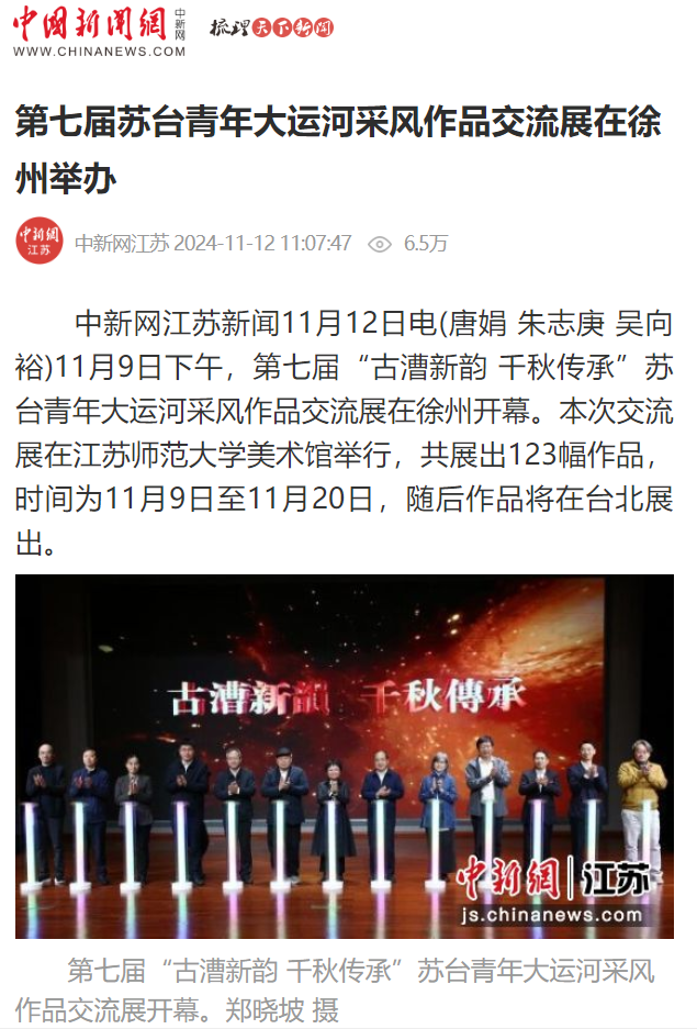 中新網(wǎng)江蘇新聞11月12日電(唐娟 朱志庚 吳向裕)11月9日下午,第七屆“古漕新韻千秋傳承”蘇臺(tái)青年大運(yùn)河采風(fēng)作品交流展在徐州開幕。本次交流展在江蘇師范大學(xué)美術(shù)館舉行,共展出123幅作品,時(shí)間為11月9日至11月20日,隨后作品將在臺(tái)北展出。