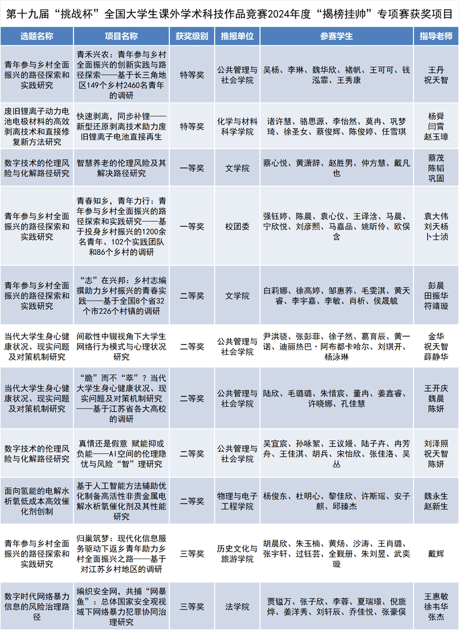 在第十九屆“挑戰(zhàn)杯”全國大學(xué)生課外學(xué)術(shù)科技作品競賽“揭榜掛帥”專項賽中,《青禾興農(nóng):青年參與鄉(xiāng)村全面振興的創(chuàng)新實踐與路徑探索——基于長三角地區(qū)149個鄉(xiāng)村2460名青年的調(diào)研》《快速剝離,同步補(bǔ)鋰——新型還原剝離技術(shù)助力廢舊鋰離子電池直接再生》榮獲特等獎,《青春知鄉(xiāng),青年力行:青年參與鄉(xiāng)村全面振興的路徑探索和實踐研究——基于投身鄉(xiāng)村振興的1200余名青年、102個實踐團(tuán)隊和86個鄉(xiāng)村的調(diào)研》《智慧養(yǎng)老的倫理風(fēng)險及其解決路徑研究》榮獲一等獎,《“志”在興邦:鄉(xiāng)村志編撰助力鄉(xiāng)村振興的青春實踐——基于全國8個省32個市226個村鎮(zhèn)的調(diào)研》《間歇性中輟視角下大學(xué)生網(wǎng)絡(luò)行為模式與心理狀況研究》《“脆”而不“萃”?當(dāng)代大學(xué)生身心健康狀況、現(xiàn)實問題及對策機(jī)制研究——基于江蘇省各大高校的調(diào)研》《真情還是假意賦能抑或負(fù)能——AI空間的倫理隱憂與風(fēng)險“智”理研究》《基于人工智能方法輔助優(yōu)化制備高活性非貴金屬電解水析氧催化劑及其性能研究》榮獲二等獎,《歸巢筑夢:現(xiàn)代化信息服務(wù)驅(qū)動下返鄉(xiāng)青年助力鄉(xiāng)村全面振興之路——基于對江蘇鄉(xiāng)村地區(qū)的調(diào)研》《編織安全網(wǎng),共捕“網(wǎng)暴魚”:總體國家安全觀視域下網(wǎng)絡(luò)暴力犯罪協(xié)同治理研究》榮獲三等獎。