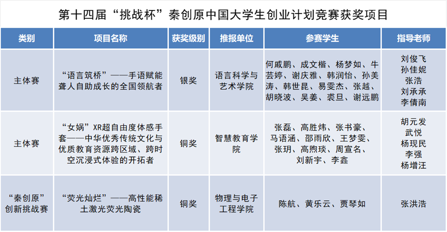 在第十四屆“挑戰(zhàn)杯”秦創(chuàng)原中國大學(xué)生創(chuàng)業(yè)計劃競賽中,《“語言筑橋”——手語賦能聾人自助成長的全國領(lǐng)航者》榮獲主體賽銀獎,《“女媧”XR超自由度體感手套——中華優(yōu)秀傳統(tǒng)文化與優(yōu)質(zhì)教育資源跨區(qū)域、跨時空沉浸式體驗的開拓者》榮獲主體賽銅獎,《“熒光燦爛”——高性能稀土激光熒光陶瓷》榮獲“秦創(chuàng)原”創(chuàng)新挑戰(zhàn)賽銅獎。