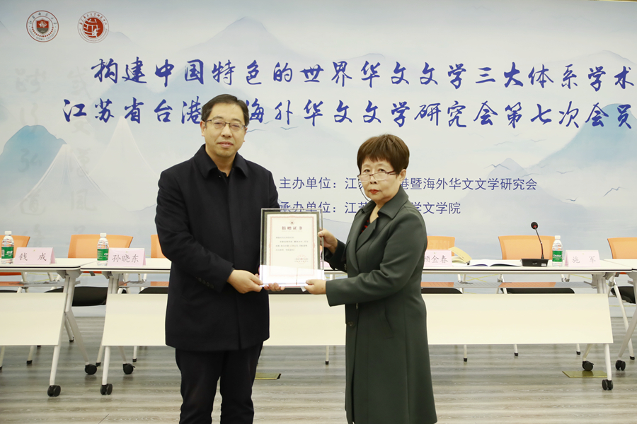 會(huì)議期間還舉行了圖書資料捐贈(zèng)儀式,江蘇省社科院劉紅林研究員向我校世界華文文學(xué)研究中心捐贈(zèng)了藏書,文學(xué)院相關(guān)負(fù)責(zé)同志向劉林紅頒發(fā)了捐贈(zèng)證書。