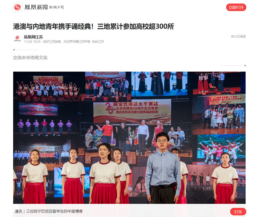 鳳凰新聞網(wǎng)11月26日報道我校語言科學(xué)與藝術(shù)學(xué)院到香港開展經(jīng)典誦讀交流有關(guān)信息,報道內(nèi)容如下: