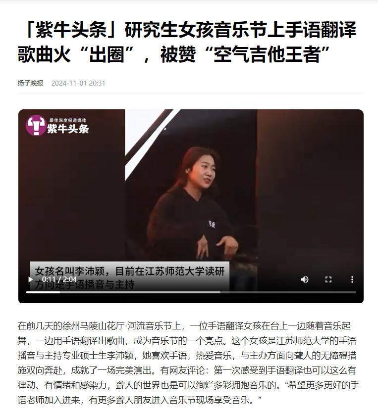 揚子晚報客戶端11月1日報道我校女研究生在音樂節上手語翻譯,報道內容如下: